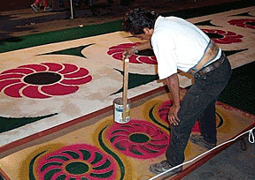 artists decorate some of the streets with fresh cut flowers and moss–usually